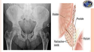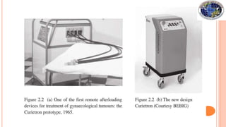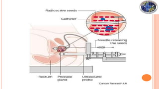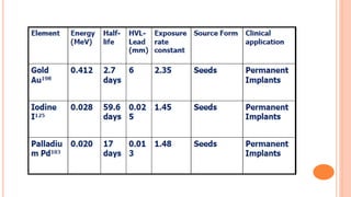 Brachytherapy involves placing small radioactive sources inside or near a tumor. It allows a high radiation dose to be delivered to the tumor while sparing surrounding normal tissues. There are several types of brachytherapy classified by source placement (interstitial, intracavitary), loading pattern (pre-loading, after-loading), dose rate (LDR, HDR), and duration of implant (temporary, permanent). Common radioactive sources used include cesium-137, iridium-192, and iodine-125 seeds. Brachytherapy provides advantages of high tumor control with minimal side effects due to rapid dose fall-off and short treatment times.