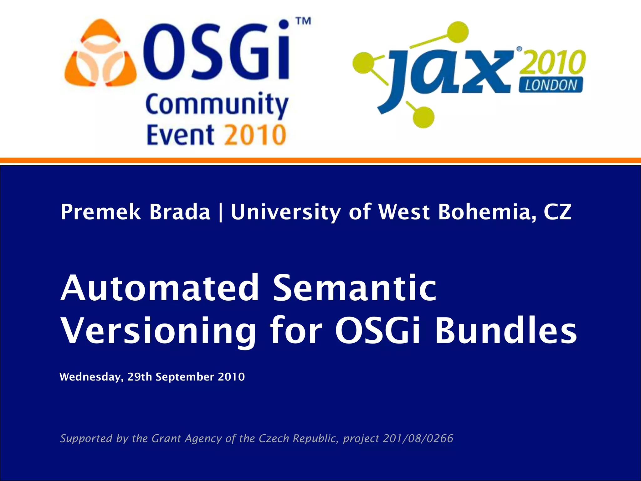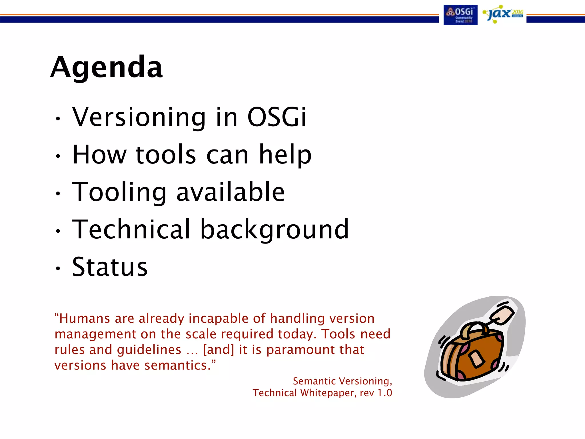 This document discusses automated semantic versioning for OSGi bundles. It begins with an overview of versioning in OSGi and how tools can help with semantic versioning. The presenter then demonstrates a tool called the OSGi Bundle Versioning Service (OBVS) that analyzes changes between bundle versions and generates semantic version IDs. Future plans include improving OBVS and integrating it with other tools to better support semantic versioning in OSGi.