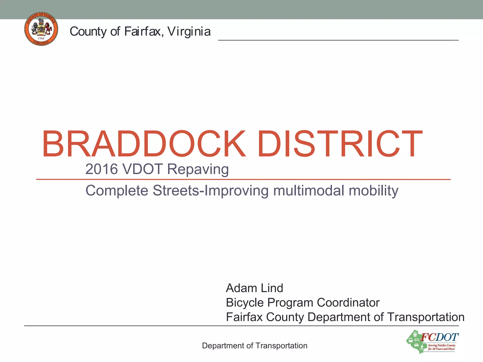 The document discusses proposed road repaving and bicycle infrastructure projects in Fairfax County, Virginia. It provides details on repaving and restriping projects planned for 2016 on several roads to add bicycle lanes and shared lanes. It summarizes proposed designs for Coffer Woods Road, Braeburn Drive, Patriot Drive, Queensberry Avenue, Guinea Road, Ravensworth Road, and Heritage Drive that would reduce lane widths to add bike lanes while keeping parking and traffic flow. Community input is sought through April 29th on the plans, which would then be refined before construction starting in summer 2016.