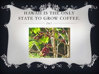 Hawaii is known for growing coffee, sugarcane, and fruits like pineapple, coconuts, and bananas. Traditional Hawaiian foods include kalua pig which is popular at luaus, and rice and poi which are commonly served alongside meat dishes.