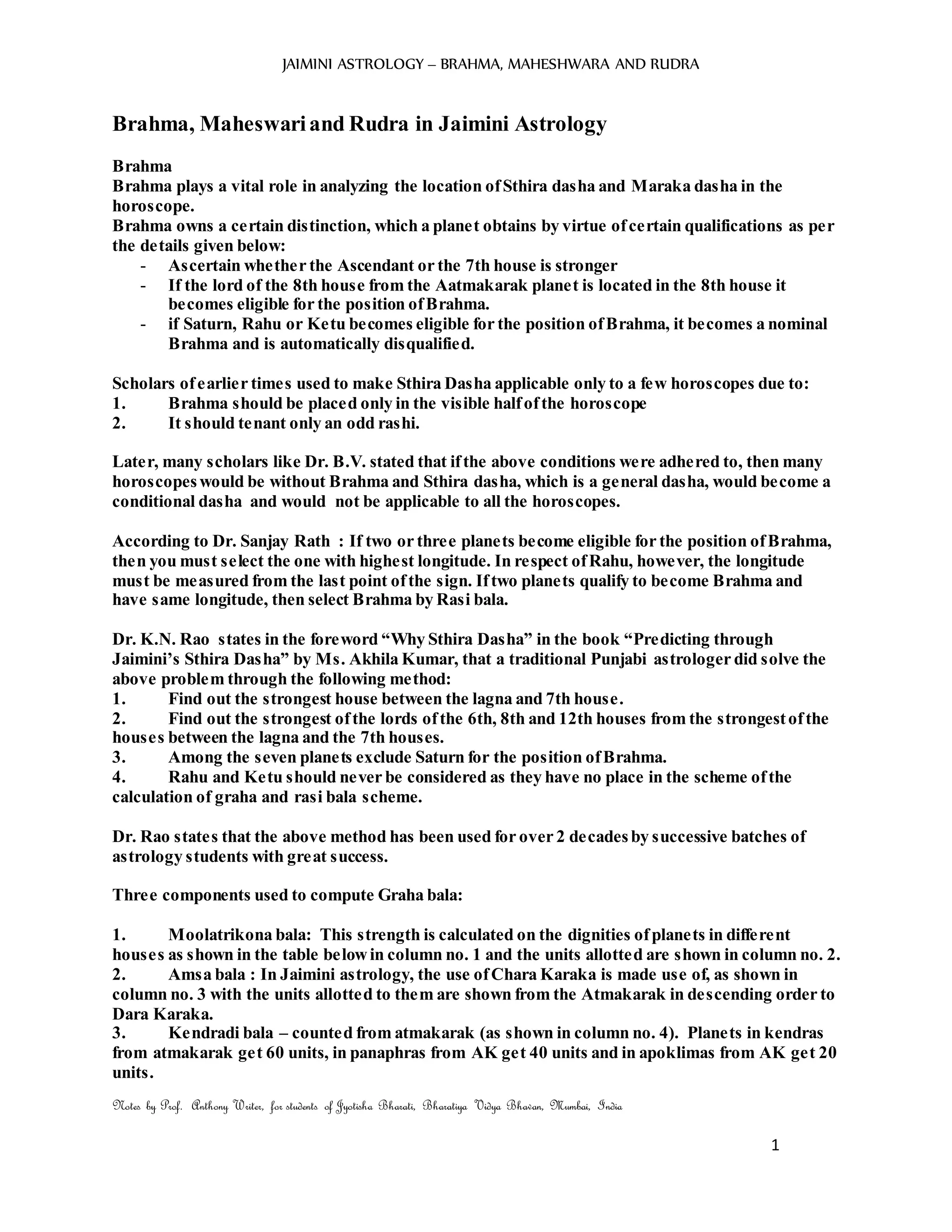 The document discusses key concepts in Jaimini astrology, focusing on the roles of Brahma, Maheshwara, and Rudra in determining planetary strength within horoscopes. It outlines steps to ascertain Brahma through analysis of houses and planets while excluding certain celestial bodies like Saturn, Rahu, and Ketu. Additionally, Maheshwara and Rudra are identified using the 8th and 2nd house lords, emphasizing their significance in astrological predictions and calculations.