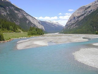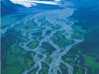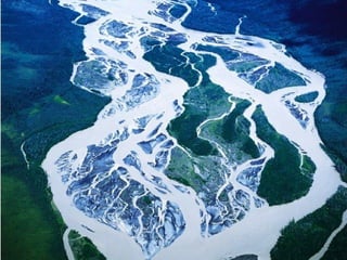 Braided river systems have multiple shallow channels that divide and rejoin, forming bars within the channels and along the banks. Sediment is transported through these channels as structureless gravel, horizontally-bedded gravel and sand, or in trough and planar cross-sets. Over time, bars migrate downstream as new material is deposited on the upstream edge and erosion occurs downstream. This cyclic process, along with variable discharge and erodible banks, causes the channels to shift and result in the braided fluvial pattern.