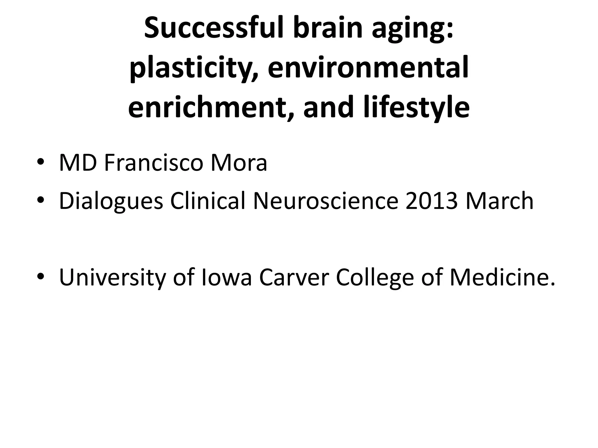 This document summarizes research on successful brain aging. It finds that aging does not necessarily mean cognitive decline, and lifestyle factors can promote healthy brain aging through plasticity. Environmental enrichment, caloric restriction, certain nutrients like omega-3 fatty acids, aerobic exercise, and stress reduction all increase neurotrophic factors like BDNF and reduce damage, helping maintain brain function and delaying neurodegenerative diseases. While aging involves some anatomical and functional changes, lifestyle interventions can support optimal cognitive functioning throughout life.