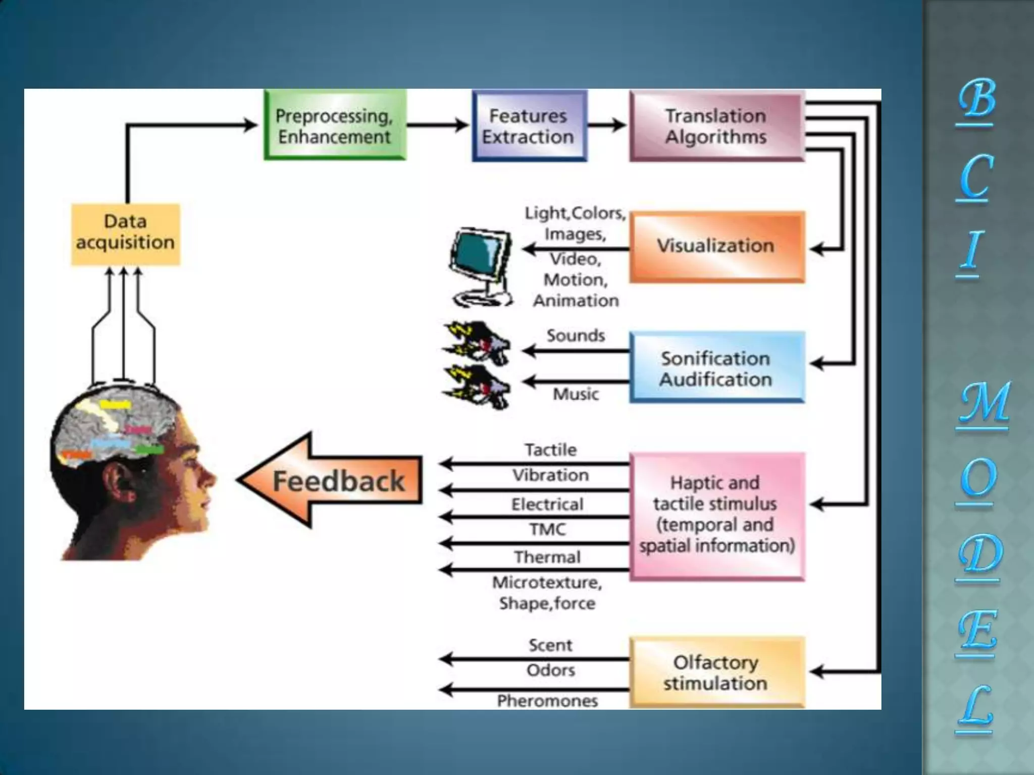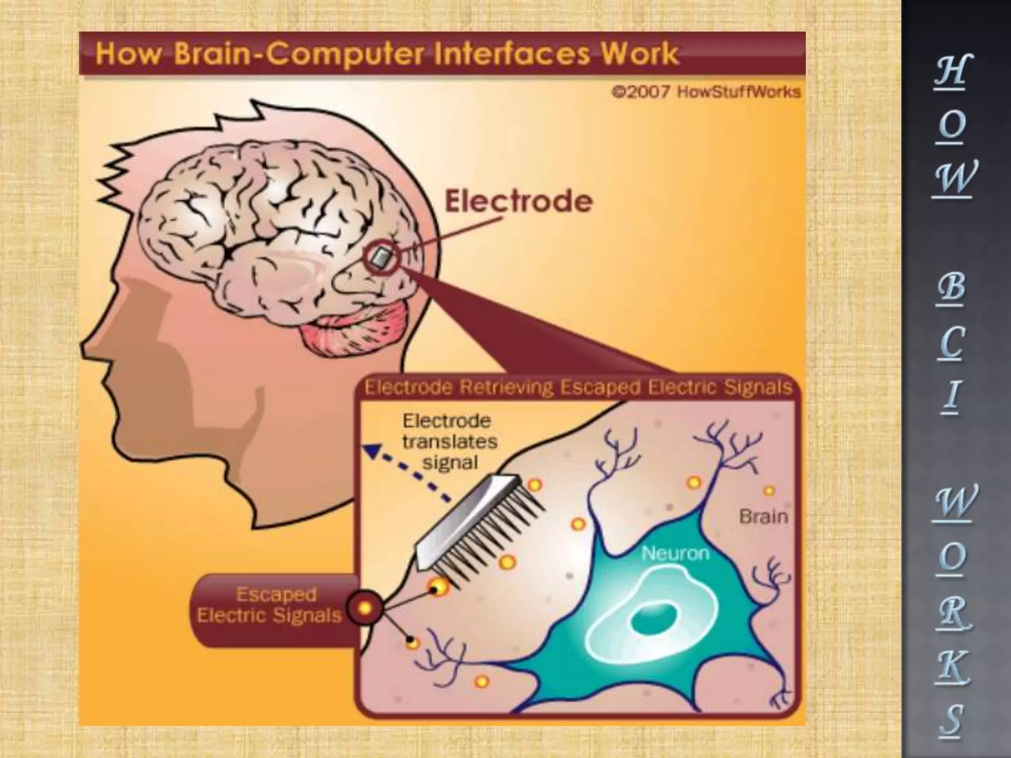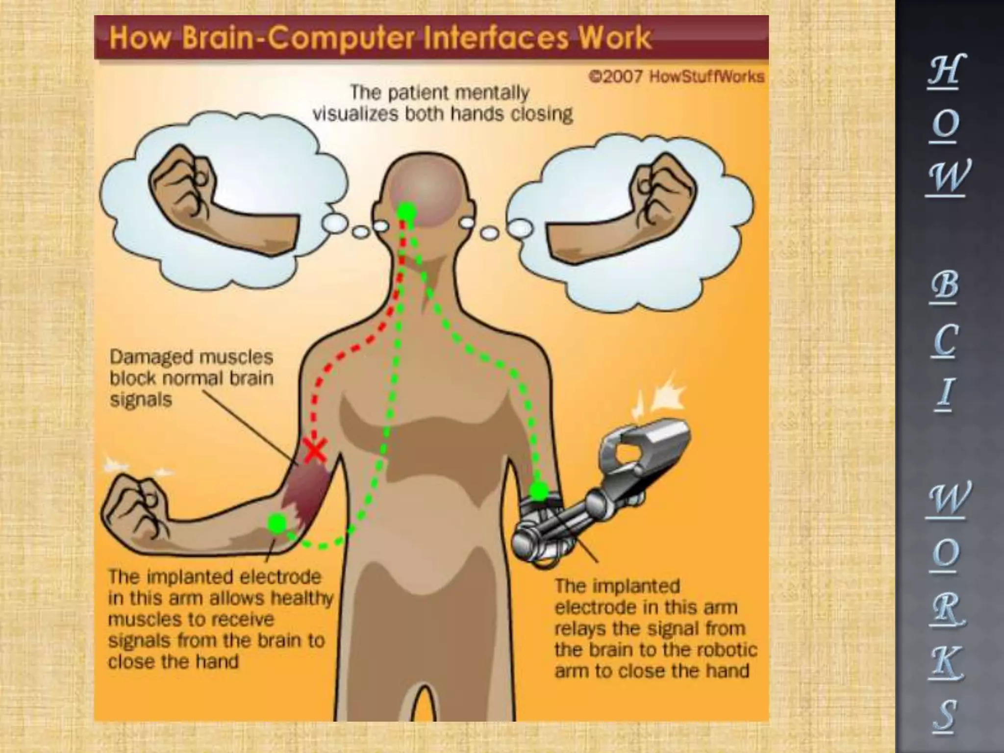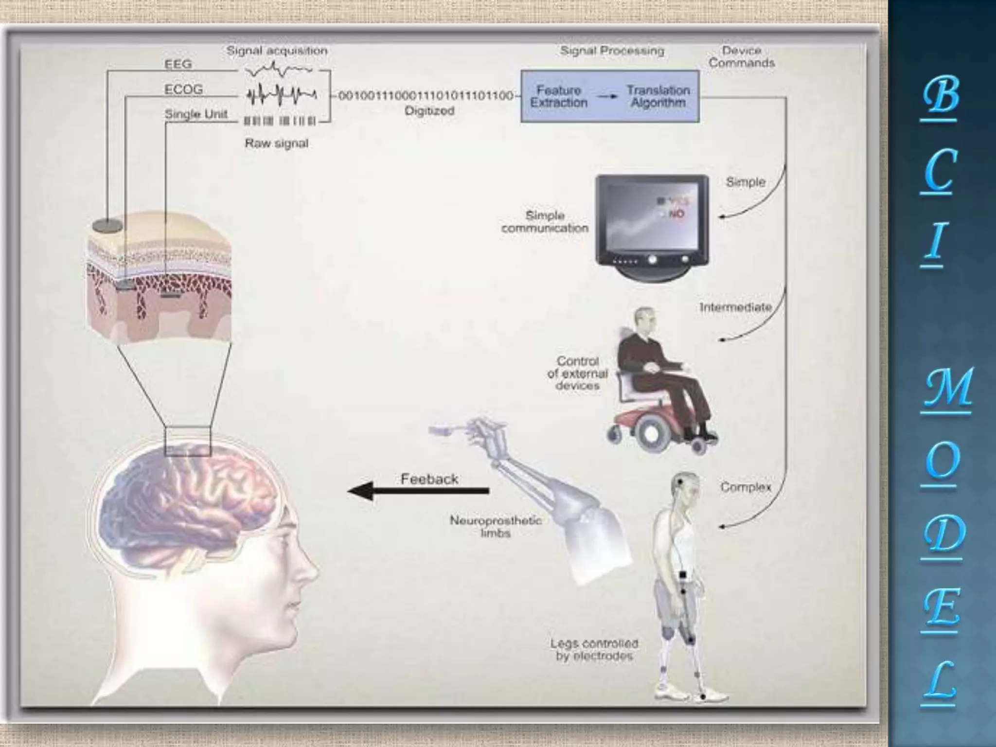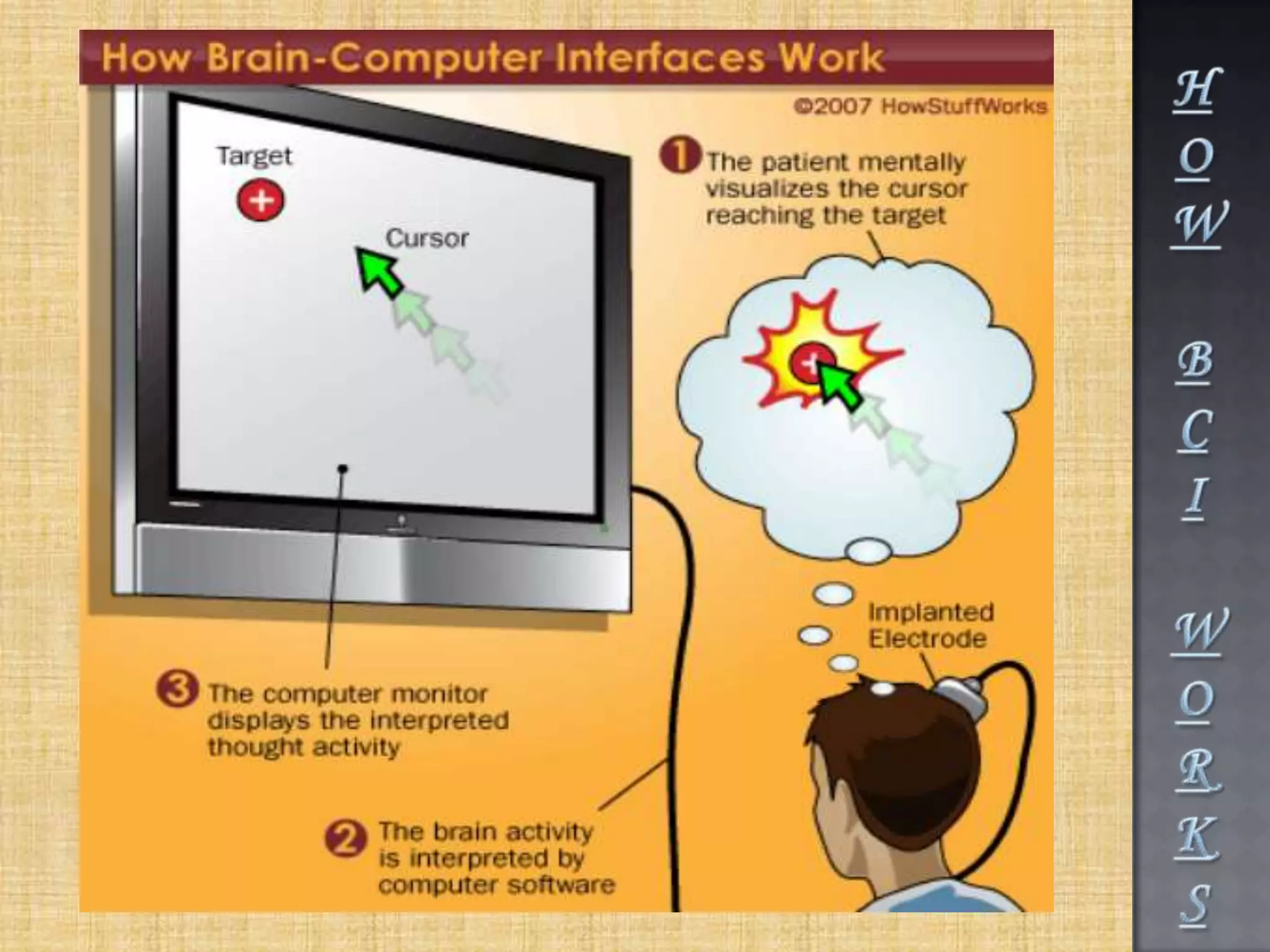 The document discusses brain-computer interfaces (BCI), including early work developing algorithms to reconstruct movements from brain activity in the 1970s. It describes different types of invasive and non-invasive BCI approaches and various applications, such as providing communication assistance to disabled individuals or controlling prosthetics. Current BCI projects aim to allow thought-based control of devices or restore sensory functions through electrical brain stimulation. However, challenges remain as BCI technology is still in early stages with crude capabilities and potential ethical concerns require further exploration.