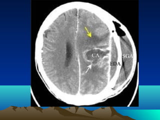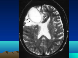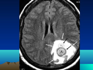 Cerebral and spinal abscesses are infections that can develop in the brain or spinal cord. Cerebral abscesses are usually caused by bacteria spreading from nearby infections through the bloodstream or openings in the dura. Clinical diagnosis involves patient history, symptoms like headache or seizures, and imaging tests like CT or MRI scans. Treatment may involve antibiotics alone or in combination with surgical drainage procedures. Outcomes depend on the patient's neurological condition, with mortality as high as 60% in cases of brain herniation. Spinal abscesses can be epidural, subdural, or intramedullary in nature and usually require both medical and surgical treatment.