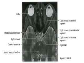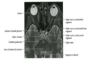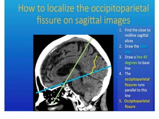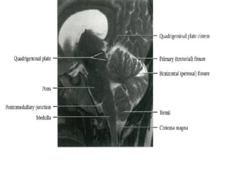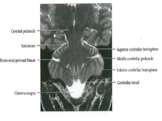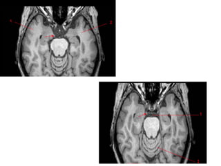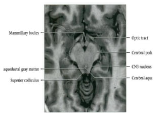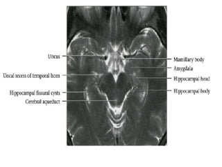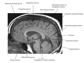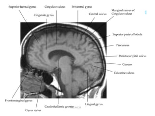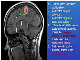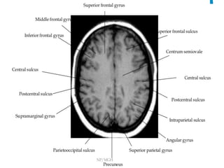 This document provides an overview of brain anatomy as seen on MRI. It describes key structures including sulci, gyri and other anatomical landmarks of the different lobes and regions of the brain. Key points covered include the location and functions of the precentral and postcentral gyri, central sulcus, sylvian fissure and other cortical structures. Subcortical structures like the hippocampus, amygdala and hypothalamus are also described. The document outlines anatomy from the cerebral cortex down through the brainstem.