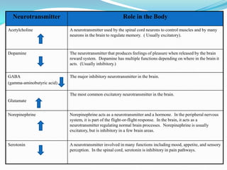 The document discusses the structure and function of the nervous system. It describes the central nervous system, which includes the brain and spinal cord, and the peripheral nervous system, which relays messages between the central nervous system and the rest of the body. It then discusses the basic unit of the nervous system, the neuron, including its main parts like dendrites, the cell body, and axon. It also explains how neurons communicate electrically within themselves and chemically between each other using neurotransmitters. Imaging techniques like EEG, CT, MRI, fMRI, and PET are also summarized that are used to study the brain.