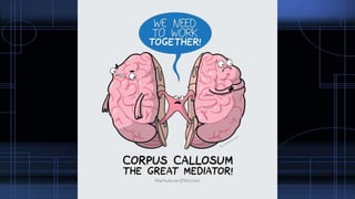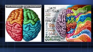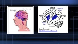The document discusses the relationship between the human brain and language. It describes that the brain has over 100 billion neurons, with language functions localized primarily in the left hemisphere. Specifically, Broca's area in the frontal lobe controls speech production, while Wernicke's area in the temporal lobe is involved in language comprehension. Different types of aphasia that result from brain damage in these areas are described, including Broca's aphasia which affects grammar and Wernicke's aphasia where speech is fluent but not meaningful. The localization of language in the brain was an area of study dating back to ancient times but was more precisely mapped out by scientists in the 19th century such as Broca and Wern