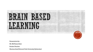 Brain-based learning is an educational approach based on principles derived from neuroscience research about how the brain learns naturally. It involves immersing students in learning experiences, maintaining a challenging but not fearful environment, and having students actively process information. Some key principles are that the brain learns holistically, is social, searches for meaning, and learns through both conscious and unconscious processes. Implementing brain-based learning strategies can improve student performance, retention, and test-taking abilities.
