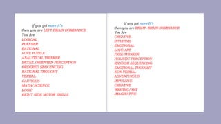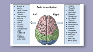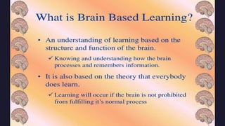 Brain-based learning is an approach that considers how the human brain learns best. It focuses on addressing student learning outcomes based on cognitive development and how the brain learns differently as people age. Some key principles are that each brain is unique, stress can impair learning, emotions are critical, and learning involves both the mind and body. Strategies for brain-based learning include chunking information, respecting individual differences, using moderate stress, improving metacognition, allowing non-learning time, and trial and error learning. The goal is to positively influence education by understanding how the brain works.