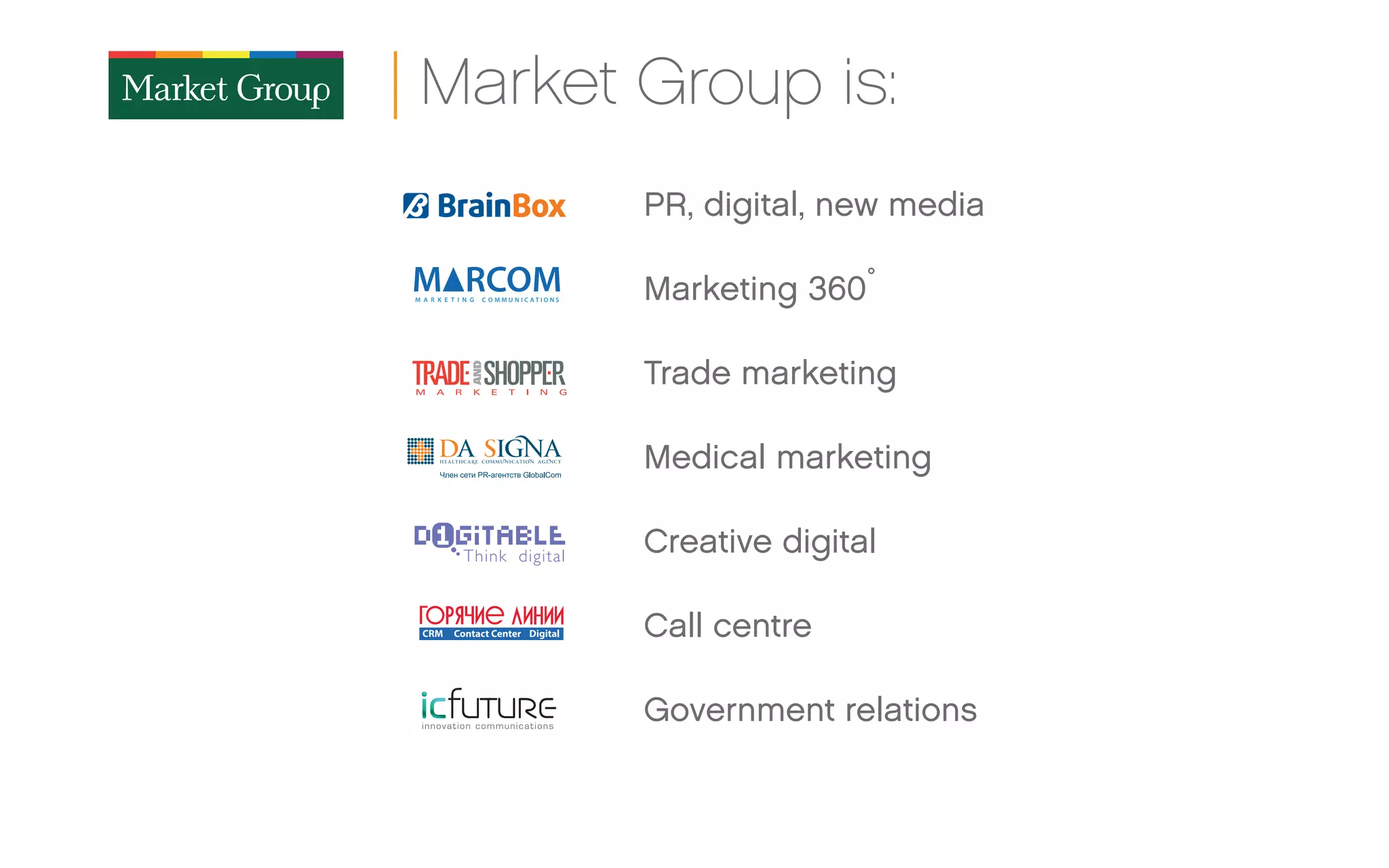 The Market Group provides PR, digital, new media, marketing and creative services. It has expertise in strategic PR, corporate PR, internet PR, SMM, creative digital and new media. The company has worked with clients such as Reebok, Tag Heuer, Unilever, Diageo, Yves Rocher, and government agencies on campaigns, press offices, events, and digital strategies. The Market Group has a team of directors and specialists with experience across PR, marketing, creative, and new business development.