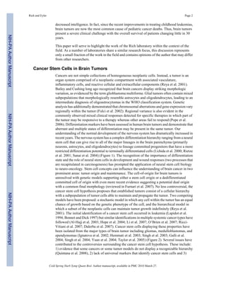 This document discusses cancer stem cells in brain tumors. It begins by providing background on brain tumors and their treatment challenges. It then discusses the cancer stem cell hypothesis, which proposes that tumors contain a cellular hierarchy with a subpopulation of stem-like cancer cells that can maintain and propagate the tumor. Studies have identified these cancer stem cells in various brain tumors through their ability to self-renew, proliferate, and initiate new tumors. However, there is still debate around this hypothesis due to inconsistencies across cancer types and lack of universal stem cell markers. The document focuses on research characterizing brain tumor stem cells and their roles in tumor biology and therapeutic resistance.
