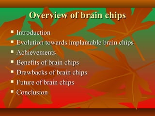 The document discusses the evolution, benefits, drawbacks, and future of brain chips, highlighting their potential to enhance human capabilities and address medical issues such as paralysis and impaired senses. It references historical developments in brain research, notably by José Delgado, and outlines applications in military and rescue operations. The conclusion emphasizes that while brain implants could significantly improve human function, they also present challenges related to identity and safety.