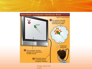 The document discusses brain-computer interfaces (BCIs), which create a direct communication link between the human brain and computers, focusing on their development and applications. It outlines the evolution of BCIs from early experiments with animals to current applications such as assisting disabled individuals, controlling devices, and potential therapeutic benefits. The conclusion emphasizes the promising future of BCIs in rehabilitation and enhancing human capabilities.