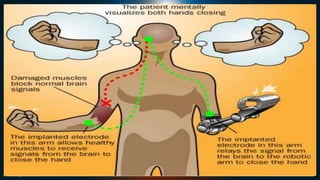 This document discusses brain computer interfaces (BCI). It begins by providing background on early pioneers in the field like Hans Berger in the 1920s-1950s. It then discusses some key BCI developments from the 1990s to present day, including devices that allow paralyzed individuals to control prosthetics or computers using brain signals. The document outlines the basic hardware and principles of how BCIs work by interpreting brain signals to control external devices. It discusses potential applications like internet browsing, gaming, or prosthetic limb control. The benefits and disadvantages of BCIs are noted, and the future possibilities of using BCIs to enhance human abilities are explored.