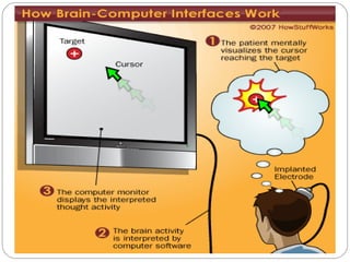 This document provides an overview of brain-computer interfaces (BCI). It defines BCI as a direct connection between the brain and a computer that provides a new communication channel. BCI works by sensing and translating electrical signals in the brain into commands to control devices in real time. The document discusses invasive and non-invasive BCI types and applications for restoring motor functions in paralyzed patients and allowing them to control devices and play games using only their thoughts. It also notes current limitations in BCI technology.