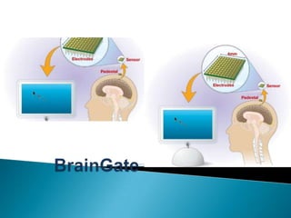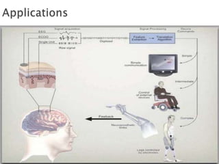 The document discusses brain-computer interfaces (BCI), highlighting their ability to connect the human brain to external devices, enabling communication and control through thought. It covers the history, types (invasive and non-invasive), components, and potential applications of BCI technology, as well as the challenges and advancements in the field. BCIs are portrayed as a promising solution for improving the lives of individuals with disabilities and have implications for various technologies including robotics and virtual reality.