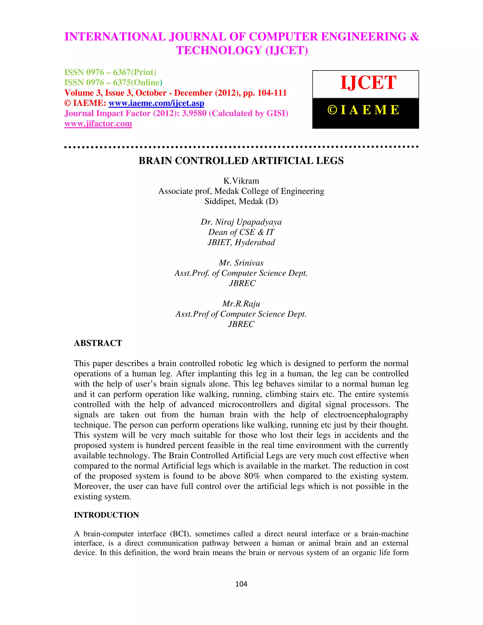 This document summarizes a research paper on brain-controlled artificial legs. It describes the key components of the system, which includes an electrode cap to detect brain signals, an amplifier to strengthen the weak signals, an analog-to-digital converter to convert the analog signals to digital, and a signal processor to extract parameters and identify patterns in the brain waves. The system is able to recognize user intentions like walking or running based on their alpha and beta brain wave patterns and control the artificial legs accordingly. This provides an affordable alternative to traditional artificial legs that gives users full control through their thoughts alone.