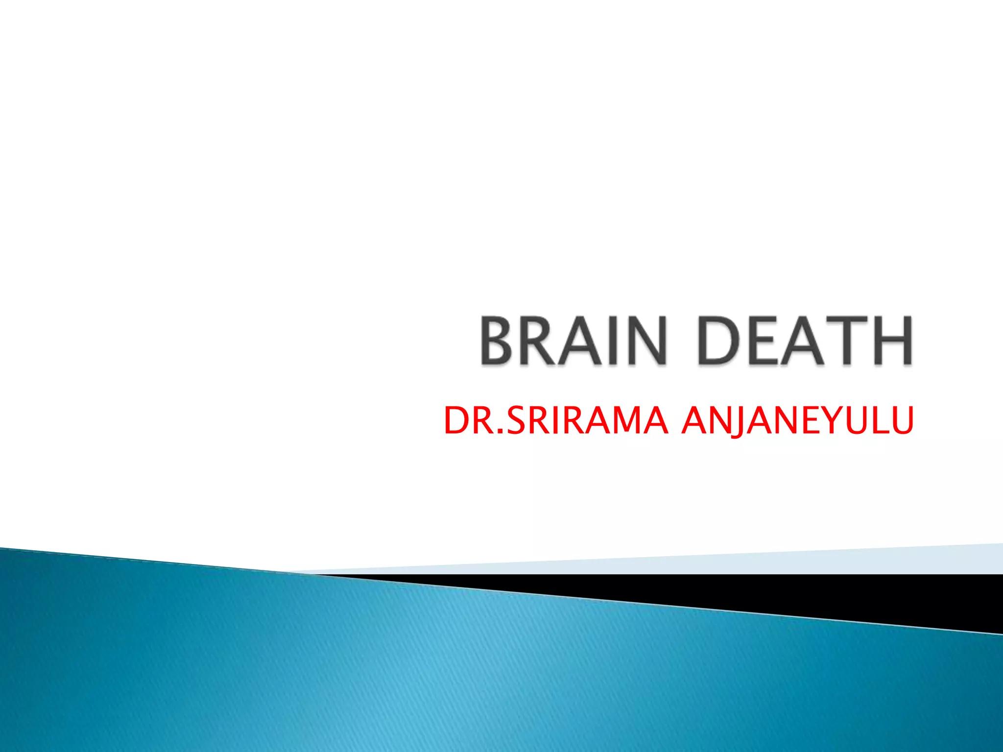 1. Brain death is defined as the irreversible loss of function of the brain, including the brainstem. It is diagnosed through clinical examinations demonstrating coma, absence of brainstem reflexes, and apnea.