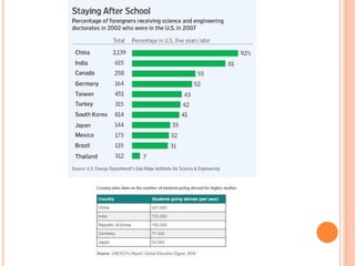 This document presents a group project on the topic of brain drain. It begins with defining brain drain as the emigration of skilled individuals for better opportunities elsewhere. It then discusses the push factors that drive people away from their home countries, like lack of employment and low wages, and the pull factors that attract them to other countries, like higher salaries and better career prospects. The rest of the document outlines the contents of the presentation, which will cover the origin of the term brain drain, types of brain drain, reasons for and consequences of brain drain in India, solutions to curb brain drain, and advantages of brain drain.