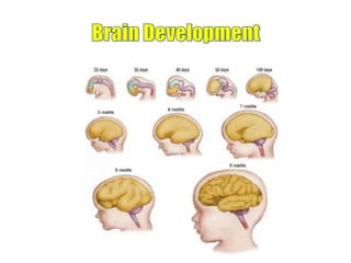 This document discusses brain development from infancy through adolescence. It notes that connections in the brain are strengthened through use and pruned away if not used. The brain grows rapidly in the first few years of life as connections are formed and then pruned away. Environmental influences shape brain development, with the earliest years seeing the most change as experiences bombard the developing brain. Brain growth continues through childhood and adolescence as different areas mature at different rates.