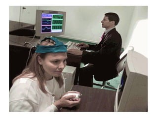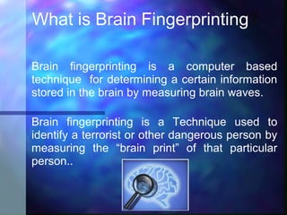 Brain fingerprinting is a technique that uses electroencephalography (EEG) to measure brain waves and determine if information about a specific event is stored in a person's brain. EEG sensors are attached to the head to measure brain responses to probes, targets, and irrelevant stimuli related to an investigated event. If the brain responds differently to targets, it suggests the person has information about the event stored. The technique has been used to identify terrorists and has a reported 100% accuracy rate in US government tests. It measures brain activity rather than eliciting a subjective response like a polygraph.