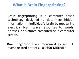 This document summarizes a seminar presentation on brain fingerprinting technology. Brain fingerprinting uses EEG to measure electrical brain wave responses, specifically the P300 wave, to stimuli presented on a computer in order to determine if individuals have hidden information stored in their brains. It works by presenting probes, targets, and irrelevant stimuli and analyzing the brain's differential response. There are four phases: evidence collection, brain evidence collection, computer analysis, and determining guilt or innocence. Unlike polygraph tests, it does not rely on physiological responses but on cognitive brain responses. Case studies showed it correctly identified information stored in a murder suspect's brain and its potential use in identifying trained terrorists.
