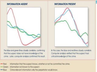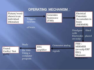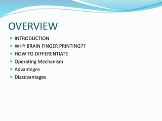 Brain fingerprinting is a technique that uses electroencephalography (EEG) to measure brain wave responses when a subject is exposed to crime-relevant stimuli. It aims to identify perpetrators based on the premise that details of crimes they committed will be stored in their brain, triggering a P300 brain signal. The technique has been shown to be 100% accurate in tests. It can help identify criminals, terrorists, and members of criminal groups by accessing crime evidence stored in their brain. However, it only detects what information is stored, not how it got there or if the subject is lying.