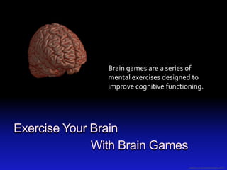 Brain games are mental exercises aimed at enhancing cognitive functioning and represent a significant industry. While studies suggest improvements in areas like processing speed and reasoning among older adults, physical exercise may offer greater cognitive benefits than brain training alone. The document discusses various studies and findings related to the effectiveness of brain games and cognitive training.