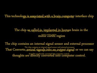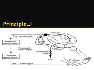 A biotech company called Cyberkinetics developed a neural interface system using internal sensors to detect brain signals and external processors to convert those signals into outputs controlled by the user. The system, called BrainGate, was founded by neuroscientist Nicholas Halsopulas and aims to allow thought to be directly translated into actions. It works by implanting a chip to monitor brain activity and interpret the user's intentions to send computer commands or operate devices.