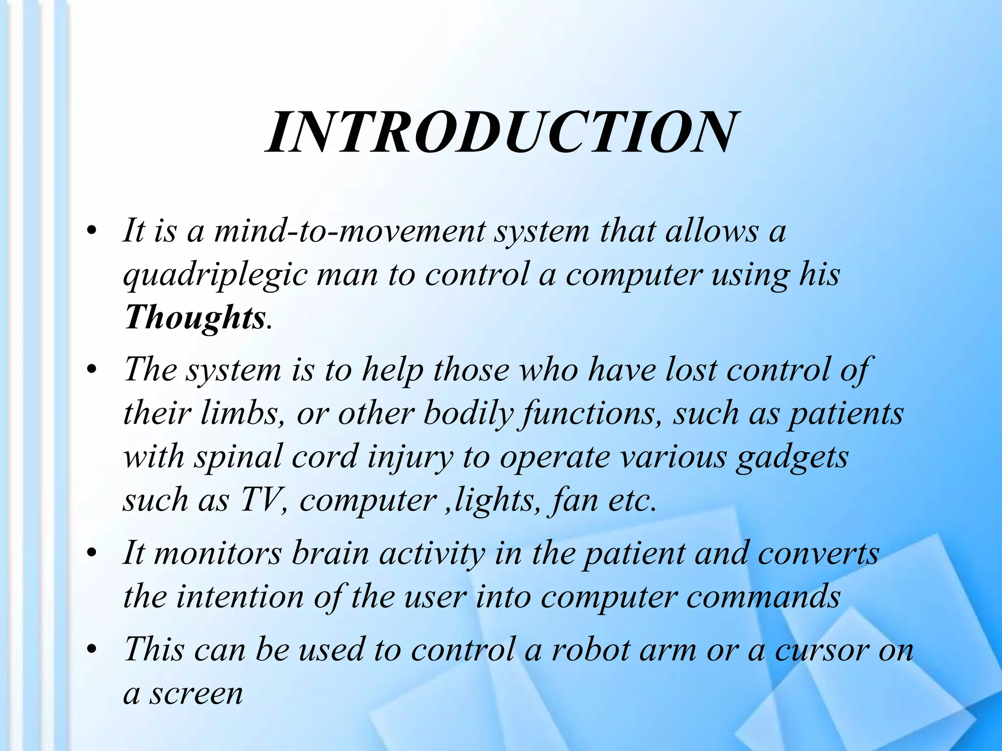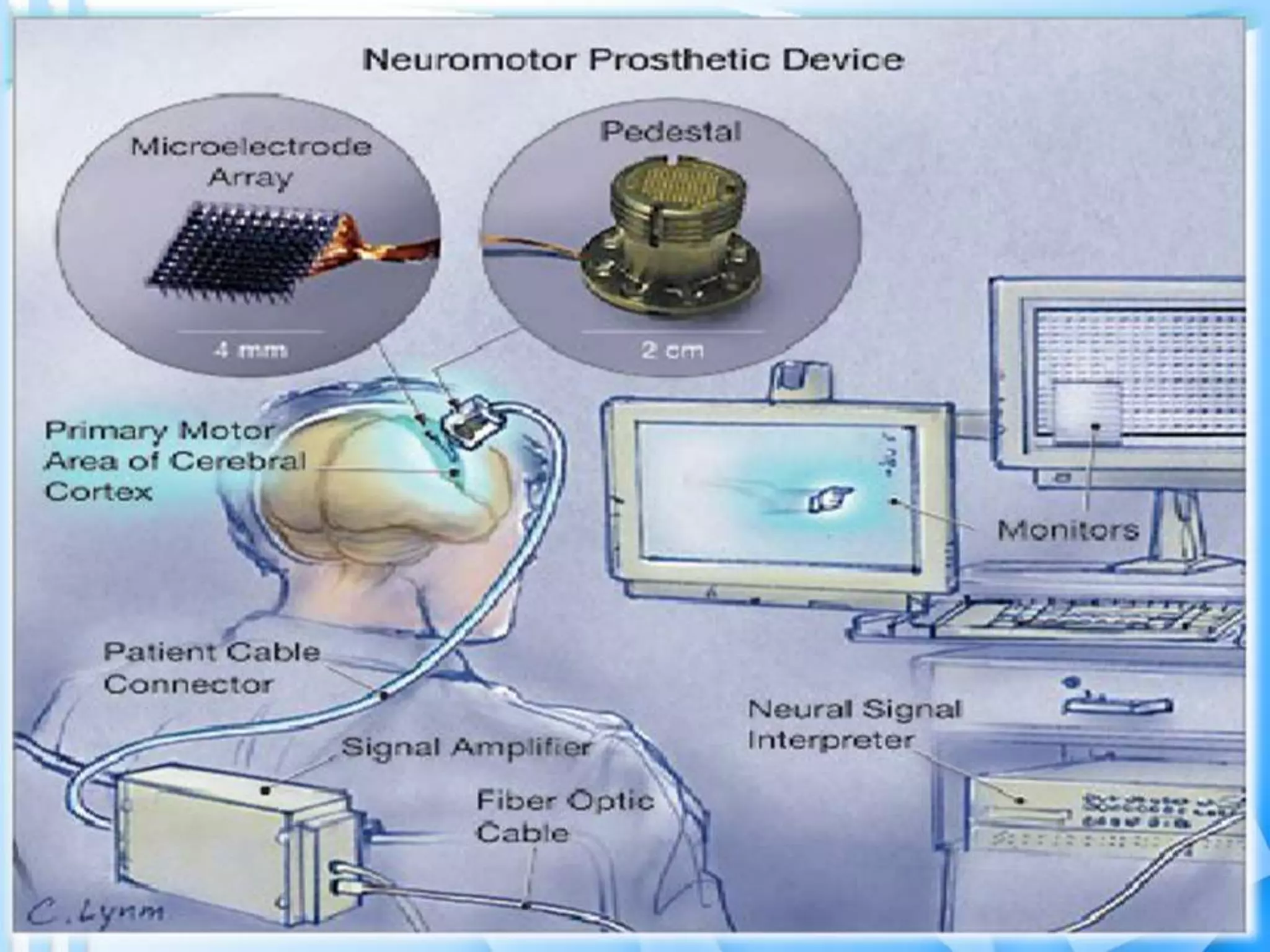The Braingate system allows a paralyzed man to control external devices like a computer using only his thoughts. It works by implanting a chip containing electrodes on the motor cortex of the brain to detect neural signals. These signals are transmitted to an external processor that decodes the thoughts and uses them to control a cursor on a screen. The first human recipient was able to use it to operate devices like a TV or computer. While it provides independence, the Braingate system is expensive, requires risky brain surgery, and has limitations in speed and wireless capability.