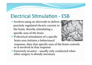1. Electrical stimulation involves using electrodes to deliver electric currents to specific brain areas to stimulate them and observe behavioral responses, helping identify brain regions' functions. However, it is highly invasive.