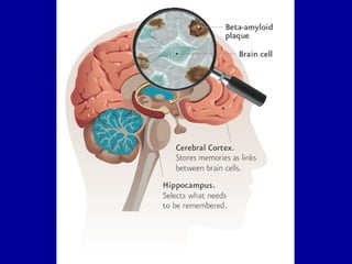 The document discusses the relationship between diet, specifically saturated fat and cholesterol intake, and the risk of Alzheimer's disease. It highlights the importance of consuming brain-healthy foods, such as plant-based options and vitamins, while avoiding harmful fats and certain medications that affect memory. Additionally, it emphasizes the benefits of physical and mental activities in reducing cognitive decline and the risk of dementia.