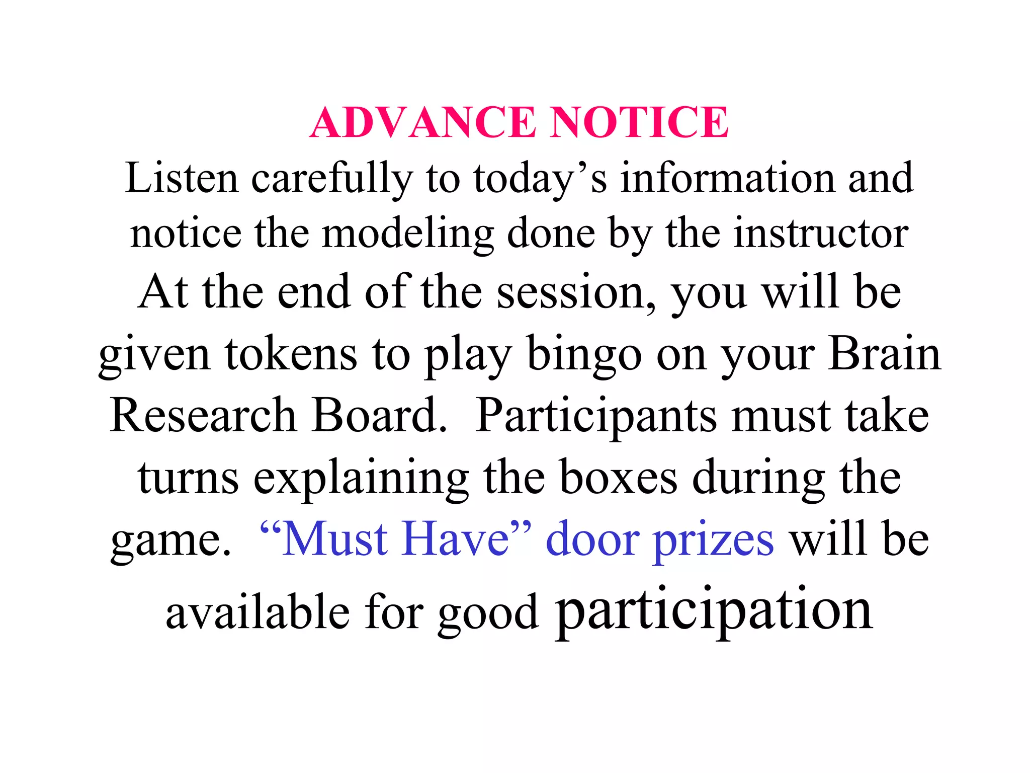 The document provides information and strategies for an instructor to engage student brains during a session. It discusses using bingo and participation prizes. It describes the left and right brain and how instruction should engage both. It recommends allowing students to verbally process new information and suggests ways to improve focus like lighting, plants, and scent. It emphasizes showing students respect and how emotion and humor can aid memory and learning. It provides sleep, hydration, and peppermint scent tips and encourages novelty, metaphors, and changing student states of mind.