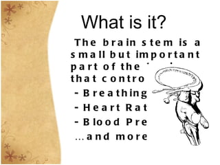 The brain stem sits at the base of the brain and controls vital functions like breathing, heart rate, and blood pressure. It has three main parts - the midbrain, pons, and medulla oblongata. The midbrain controls vision and hearing, the pons helps with sleep and attention, and the medulla controls automatic functions like breathing and digestion. Injuries to the brain stem can impact functions like breathing, swallowing, balance, and more. The document describes two cases - a woman who became quadriplegic at age 13 from a brain stem injury and a man who was injured in a car accident and had limited mobility until receiving stem cell treatment.
