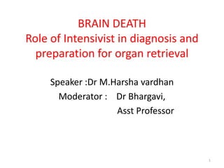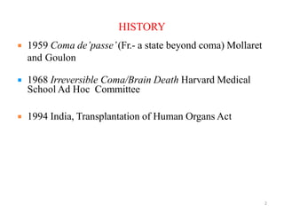 1) Brain death is the irreversible loss of all brain and brainstem functions and is diagnosed clinically through examination of coma, absent brainstem reflexes, and apnea on testing.