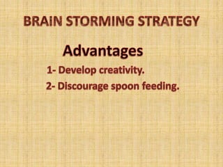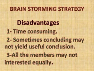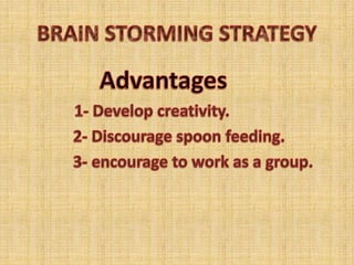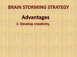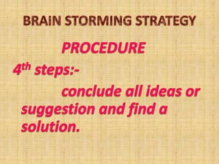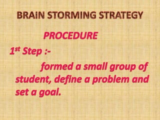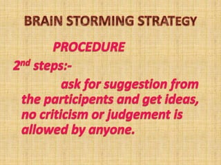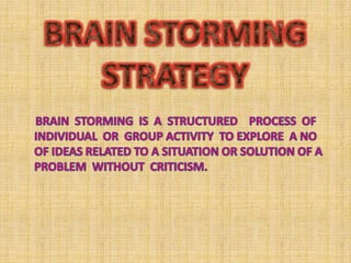 This document outlines the purpose and materials needed for a brainstorming session. The purposes are to promote creative thinking, generate a quantity of ideas, work as a group to solve a problem, and provide an opportunity for students to share ideas and expand their knowledge. The materials needed are a problem to solve, a group to work as a team, a large sheet to write on, and a facilitator.