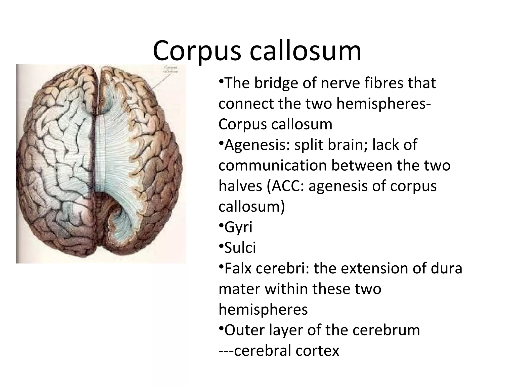 The document details the anatomy and functions of various brain structures, including the corpus callosum, thalamus, hypothalamus, midbrain, pons, and medulla oblongata. It highlights the role of these structures in regulating sensory inputs, motor functions, hormonal release, and vital reflexes. Additionally, it discusses the consequences of damage to specific areas, such as personality changes and loss of sensory perceptions.