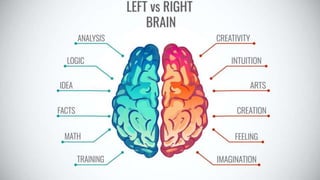 The document discusses the structure and function of the human brain. It is divided into several main sections: the cerebrum, cerebellum and brainstem which make up the three main parts of the brain. The cerebrum is the largest part and is divided into four lobes (frontal, parietal, occipital, temporal) which each control different functions. The cerebellum coordinates movement and balance, while the brainstem performs vital automatic functions. The left and right hemispheres each control the opposite side of the body and have slightly different functions. The limbic system controls emotions, and the pituitary gland regulates hormones.