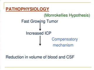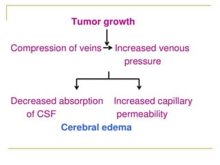 A brain tumor is a localized growth of abnormal cells within the skull that takes up space. Brain tumors are broadly classified as either primary (originating in the brain) or secondary (metastasized from another location). Primary brain tumors include gliomas (arising from brain tissue), meningiomas (arising from membranes surrounding the brain), pituitary adenomas, and acoustic neuromas. Common symptoms include headache, nausea, seizures, and mental status changes. Diagnosis involves imaging tests like CT and MRI scans as well as biopsy. Treatment options include surgery, chemotherapy, and radiation therapy depending on the type and grade of the tumor.