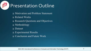 The document presents a study on brain tumor segmentation using an enhanced 2D U-Net model at the 2022 ICCIT conference, highlighting the challenges of segmenting MRI images due to overlapping modalities. It reviews related works achieving various dice scores and establishes research questions aimed at improving model performance. The findings indicate that the proposed model outperforms traditional machine learning models, with recommendations for future work including the exploration of 3D U-Net models to minimize information loss.