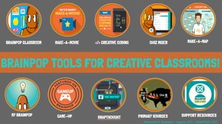 This document summarizes various tools available through BrainPOP Classroom that allow teachers to assign creative projects to students and provide feedback. It describes tools for making movies, concept maps, quizzes, coding projects, and reflections on gameplay that students can submit. Teachers can set up classes, track student work, and use resources on primary sources, games, and support documents.