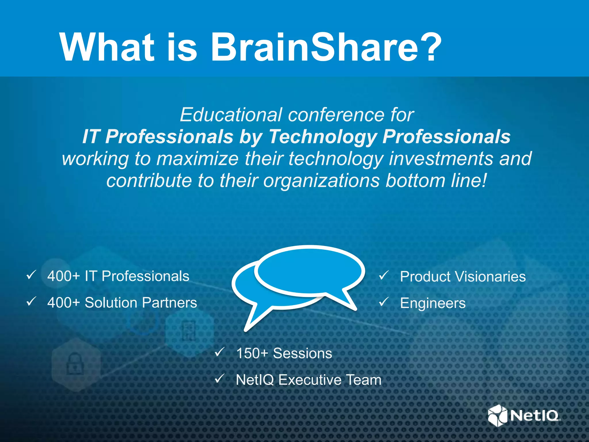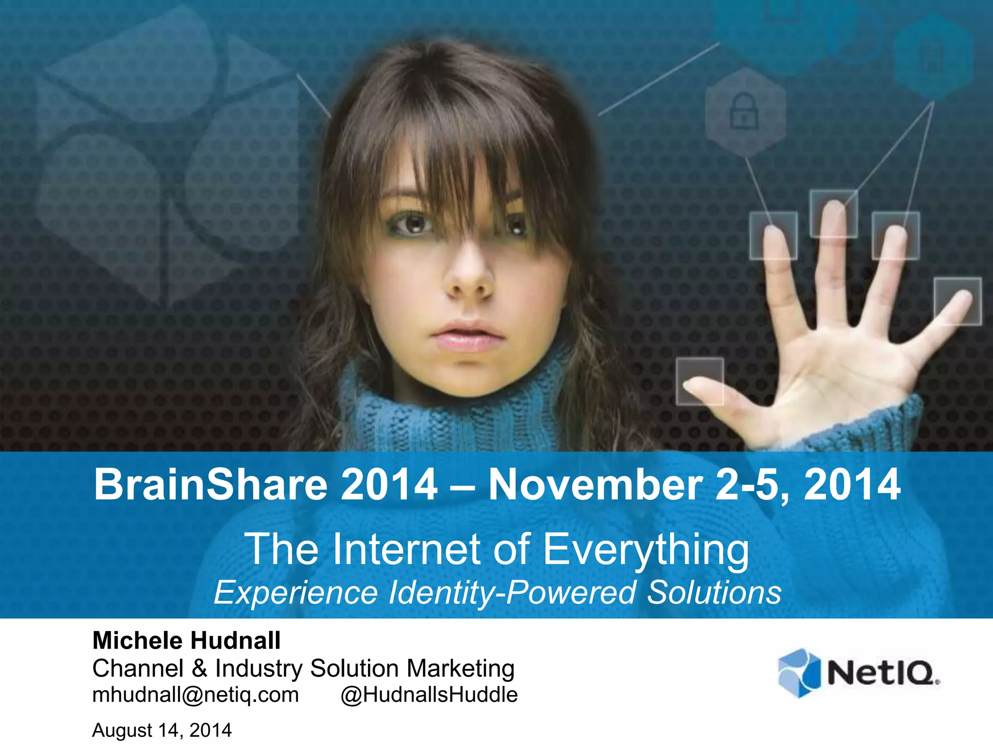 This document provides information about the BrainShare 2014 conference to be held November 2-5, 2014. The conference will focus on identity-powered solutions and the Internet of Things. It will include over 150 sessions, presentations from NetIQ executives, and opportunities to network with over 400 IT professionals and solution partners. The document encourages partners to register their customers for the conference at a discounted rate.