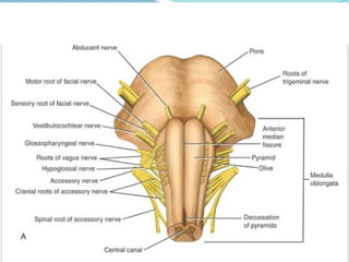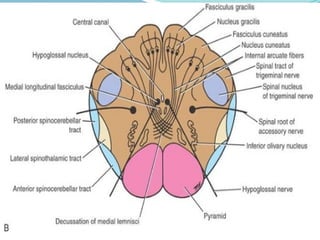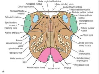 The document outlines the anatomy and functions of the brainstem, which consists of the medulla oblongata, pons, and midbrain, connecting the spinal cord to the forebrain. It details the internal structure of the medulla, including the pyramids and various nuclei that control critical functions such as respiration and cardiovascular responses, as well as sensory and motor pathways. The text also describes the medulla's gross appearance, the levels of decussation, and the organization of cranial nerve nuclei, contributing to an understanding of the brainstem's role in the nervous system.