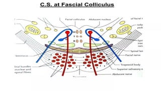 The brain stem consists of the midbrain, pons, and medulla oblongata, serving as a conduit for neural pathways between the cerebrum and spinal cord, and is crucial for vital reflexes and unconscious behaviors. It houses nuclei for cranial nerves III to XII and connects to the cerebellum through cerebellar peduncles. The brainstem's structure includes various functional regions, facilitating processes such as consciousness regulation and sensory integration.