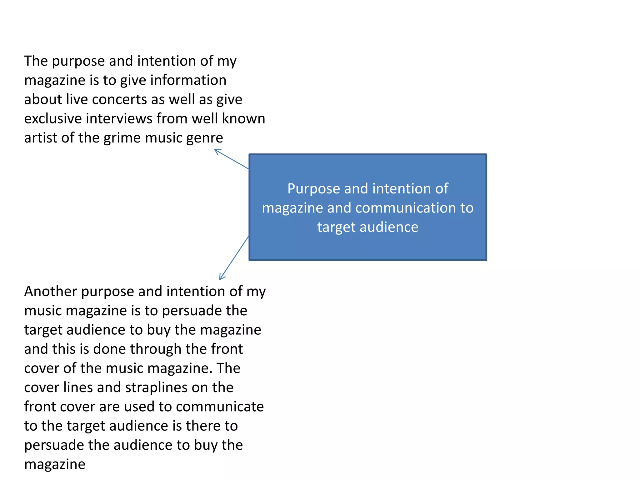 This magazine aims to inform its audience about live concerts and interviews with famous grime artists. It also intends to persuade its target readership to purchase the magazine by using attention-grabbing cover lines and headlines that communicate the compelling content inside.