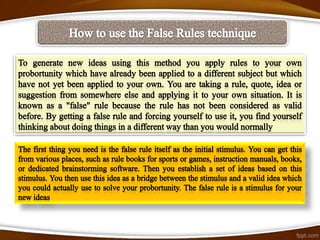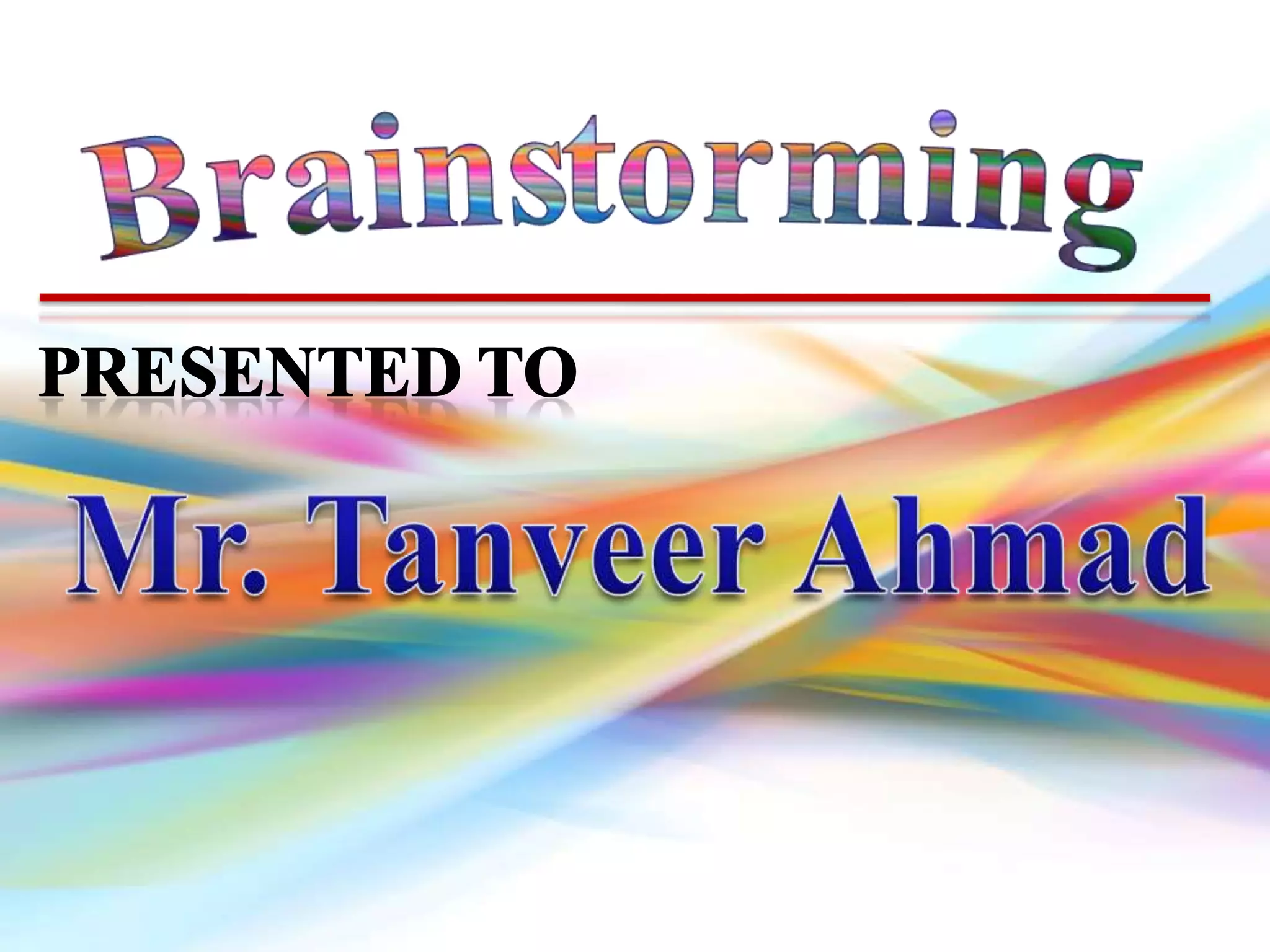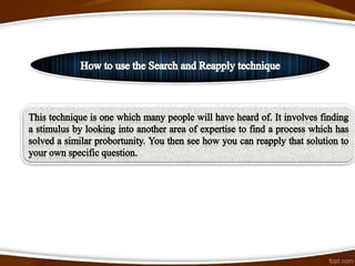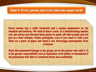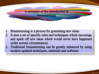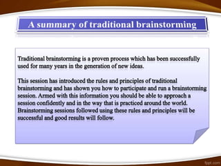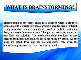 Brainstorming is a process for generating new ideas in a group setting. There are traditional and advanced forms of brainstorming. Traditional brainstorming involves a group generating ideas without judgment. Advanced brainstorming uses specialized creative thinking techniques to increase the number and diversity of ideas. These techniques include random words, pictures, websites, role playing, and challenging assumptions to prompt new perspectives. The benefits of brainstorming include developing new opportunities and solutions, while the risks can be overcome with proper facilitation and techniques.
