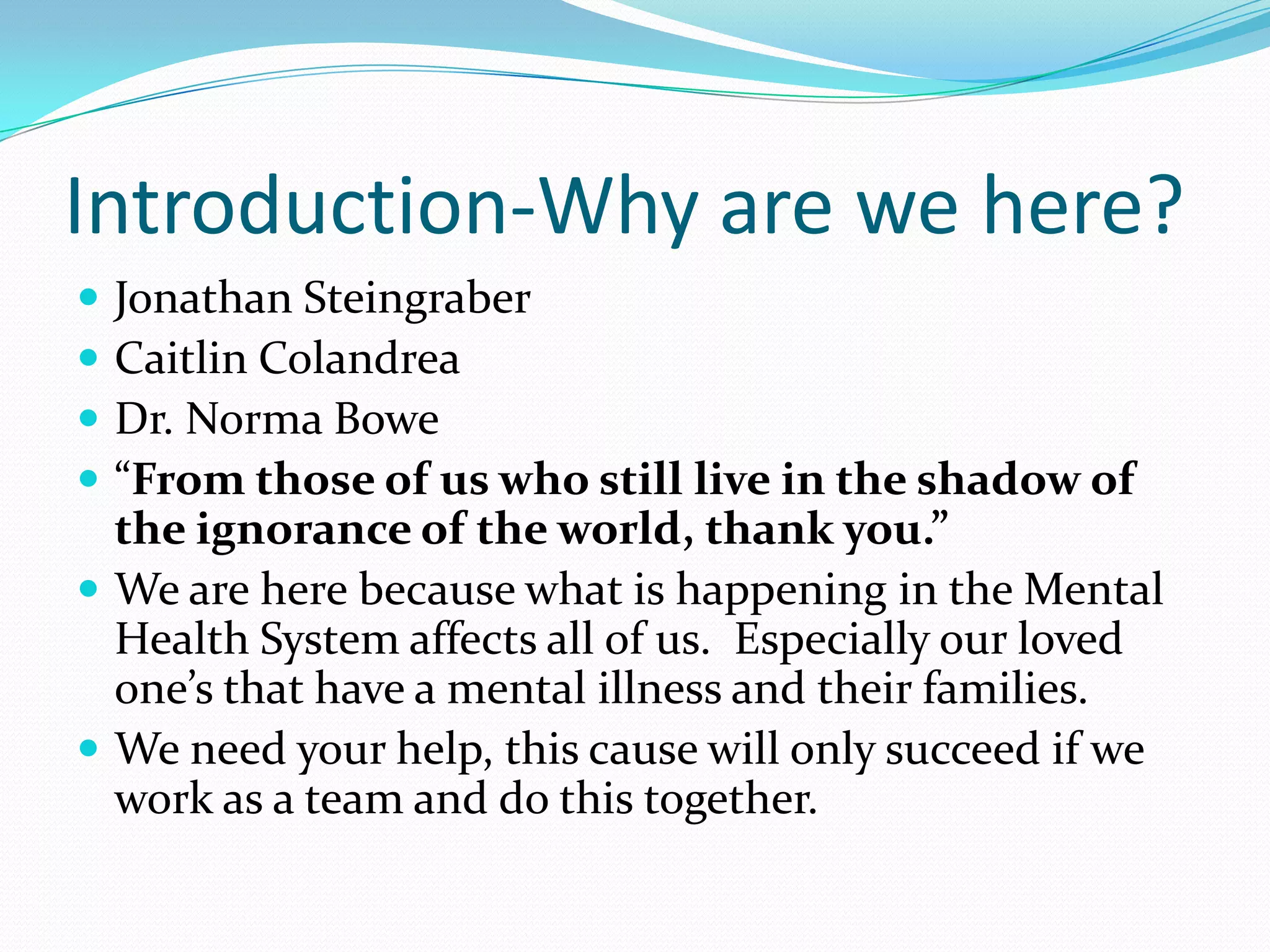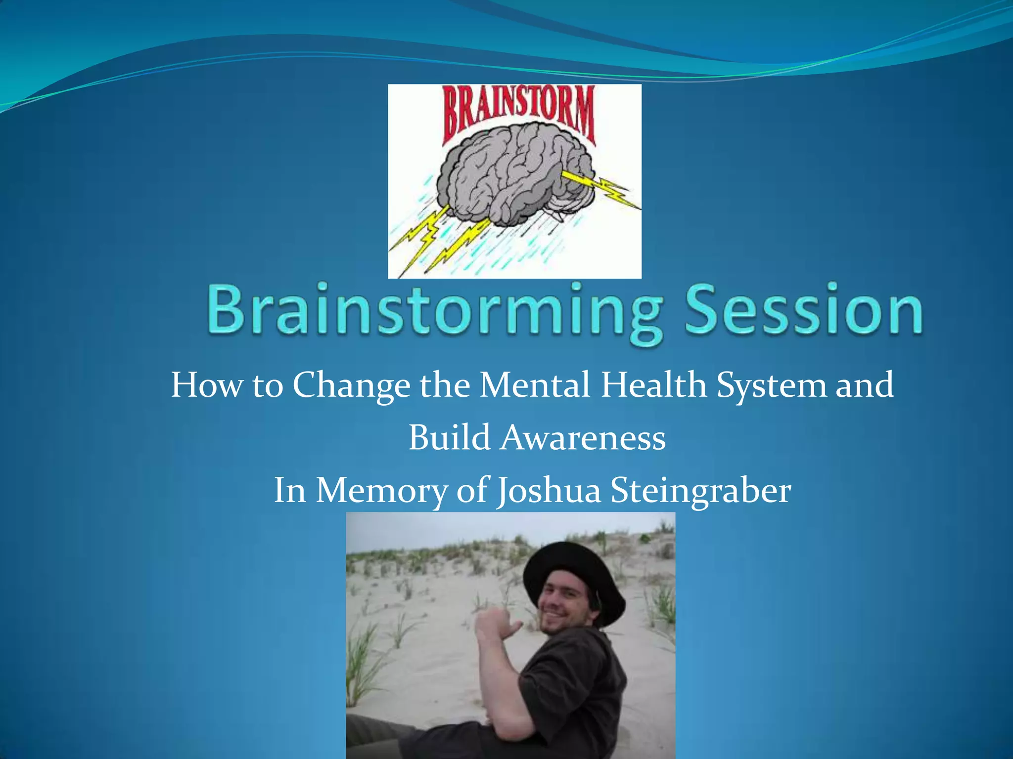 The document discusses a brainstorming session aimed at reforming the mental health system in memory of Joshua Steingraber, highlighting the personal and systemic issues surrounding mental illness. It provides statistics on mental health disorders, the disturbing rates of homelessness and incarceration among the mentally ill, and advocates for improved treatment and awareness. The mission encourages community involvement to raise funds and awareness to de-stigmatize mental illness and improve care systems.