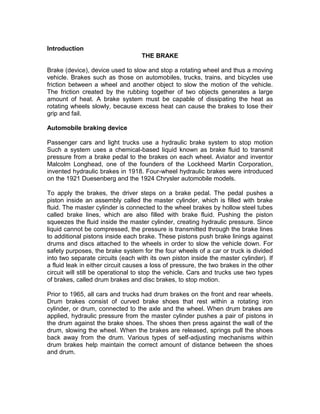 The document provides information about braking systems in automobiles. It discusses the components and functioning of drum brakes and disc brakes. It also describes the hydraulic brake system used in most passenger vehicles and the introduction of anti-lock braking systems (ABS) in the 1980s. ABS uses sensors and valves to prevent wheel lockup during hard braking, maintaining steering control. Causes of brake failure include issues that reduce friction like grease or worn components, and remedies involve replacing or adjusting the faulty parts.