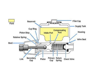 The document provides an extensive overview of braking systems in vehicles, highlighting their functions, requirements, basic terminology, and various types of brake mechanisms such as drum brakes, disc brakes, and hydraulic systems. It elaborates on principles of braking, factors influencing stopping distance and time, and classifications based on purpose and construction. Additionally, it covers advanced braking technologies like anti-lock braking systems (ABS) and the role of power brakes in enhancing braking effort.